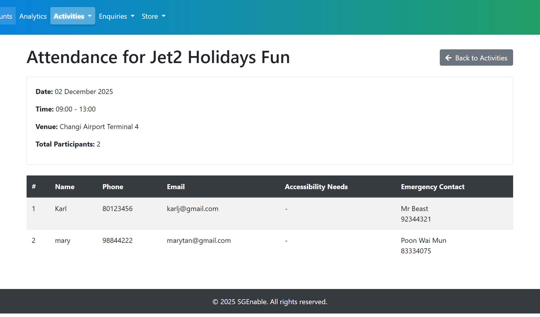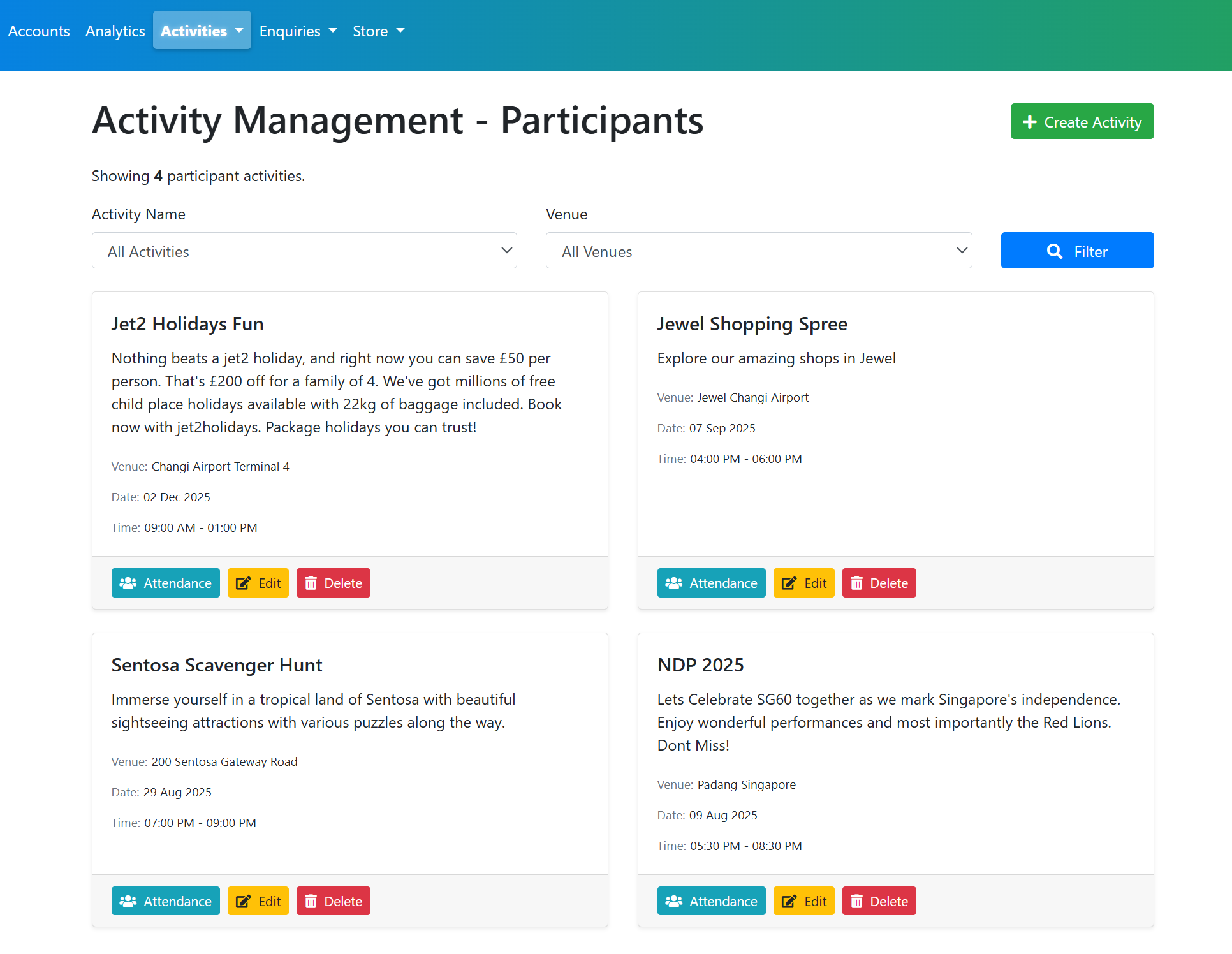Staff portal – centralised dashboard for managing accounts, activities, transactions (with multi‑payment support), and enquiries.