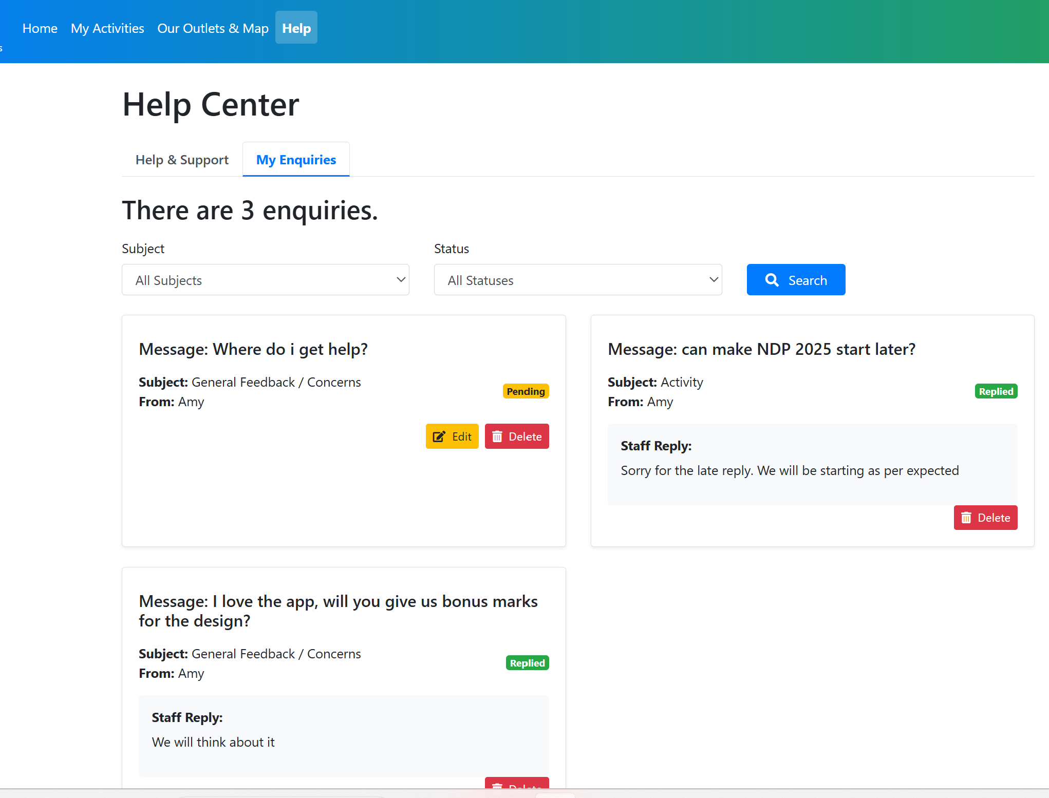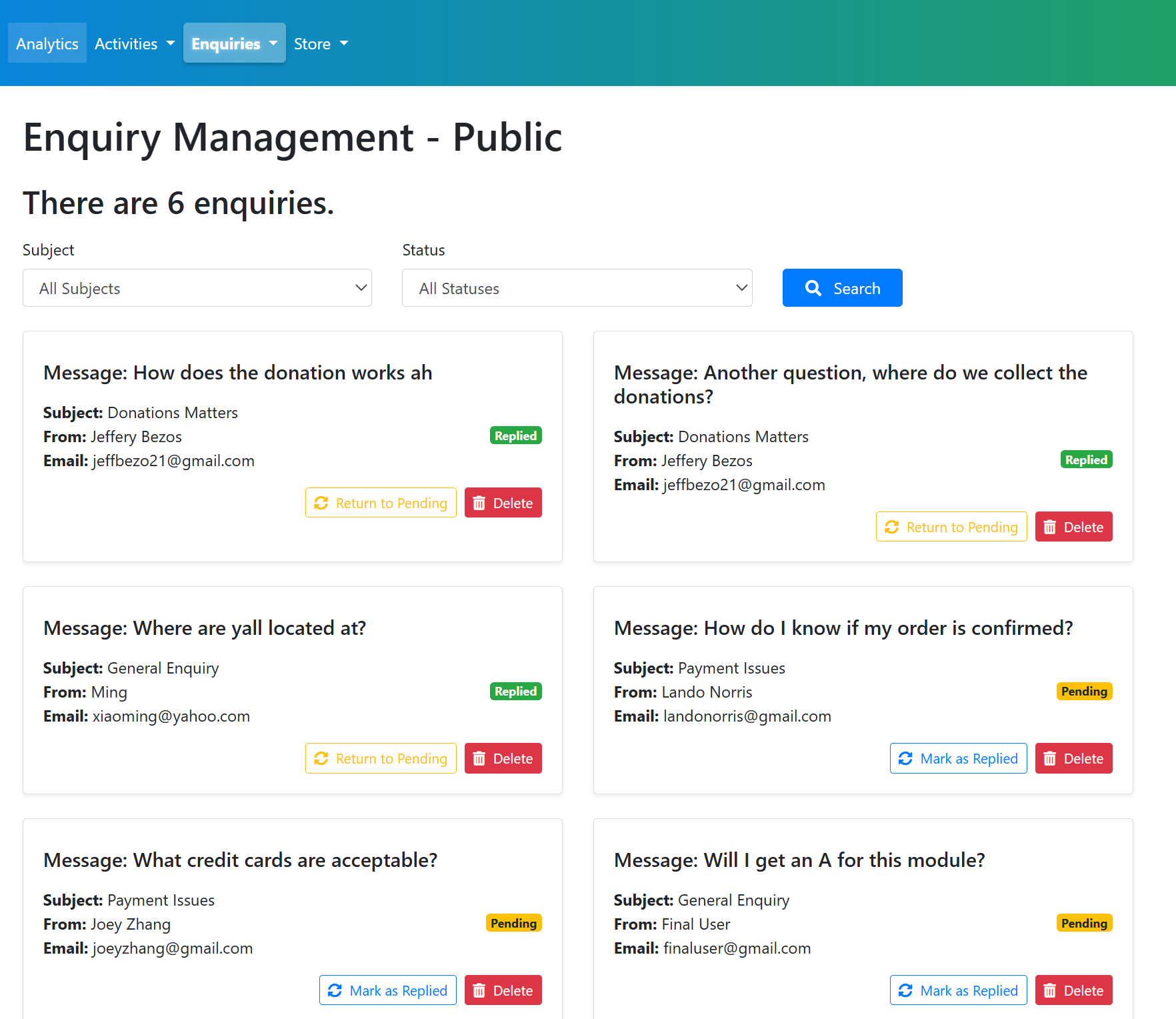 Customer support system – unified enquiry management with reply functionality for both public and registered users.