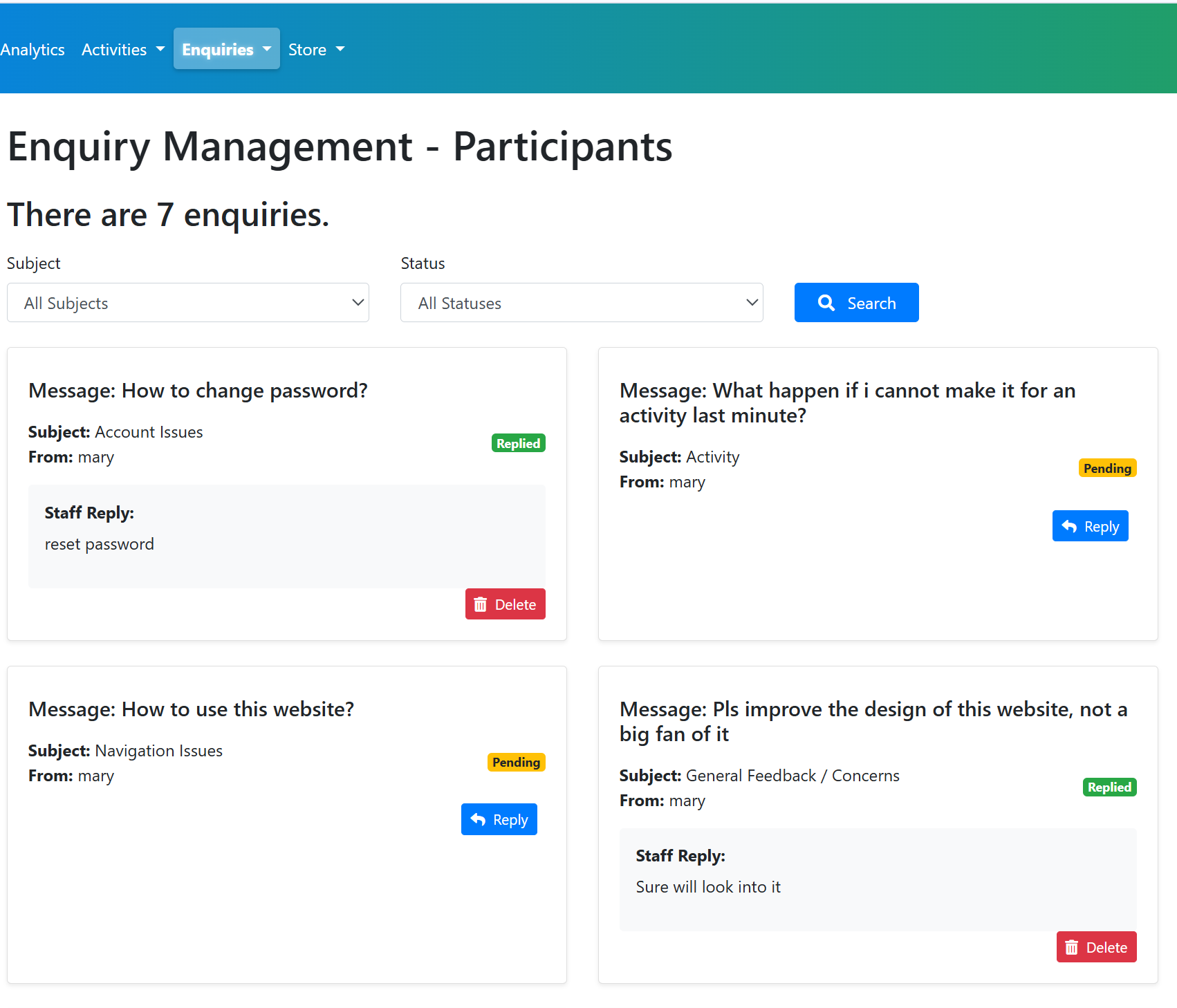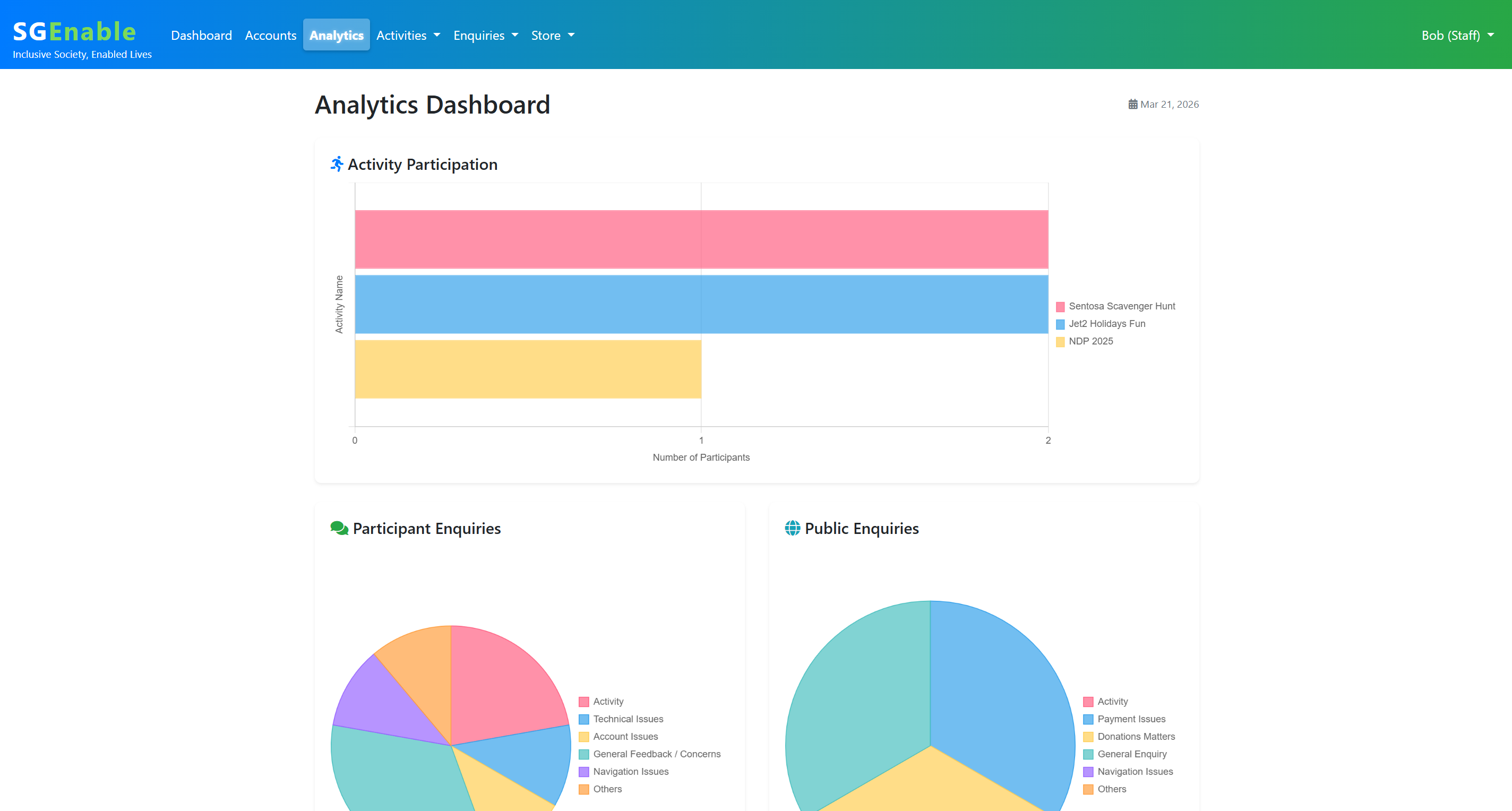 Staff analytics dashboard – built with Chart.js to visualise activity participation trends and enquiry categories.