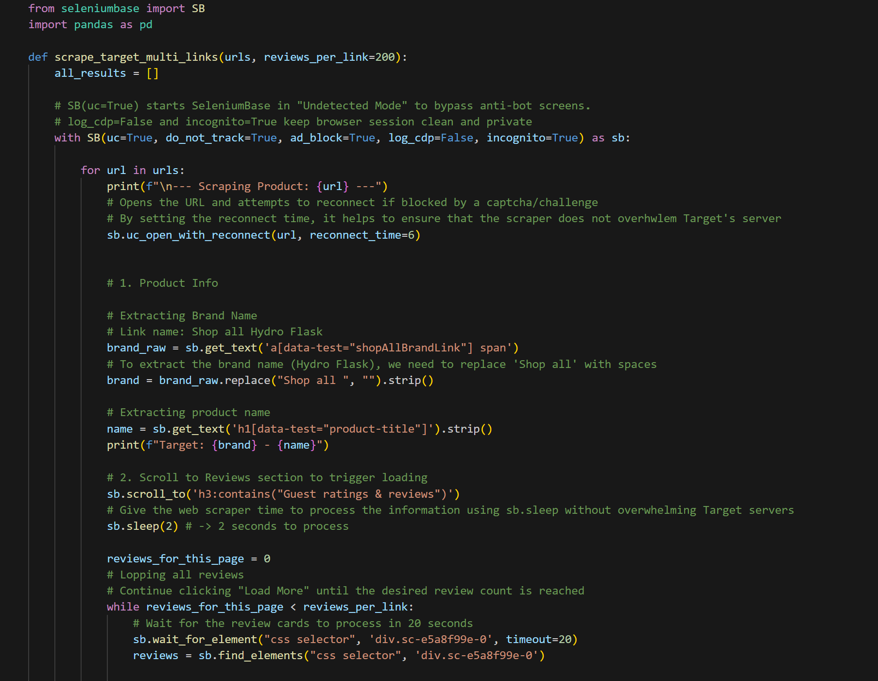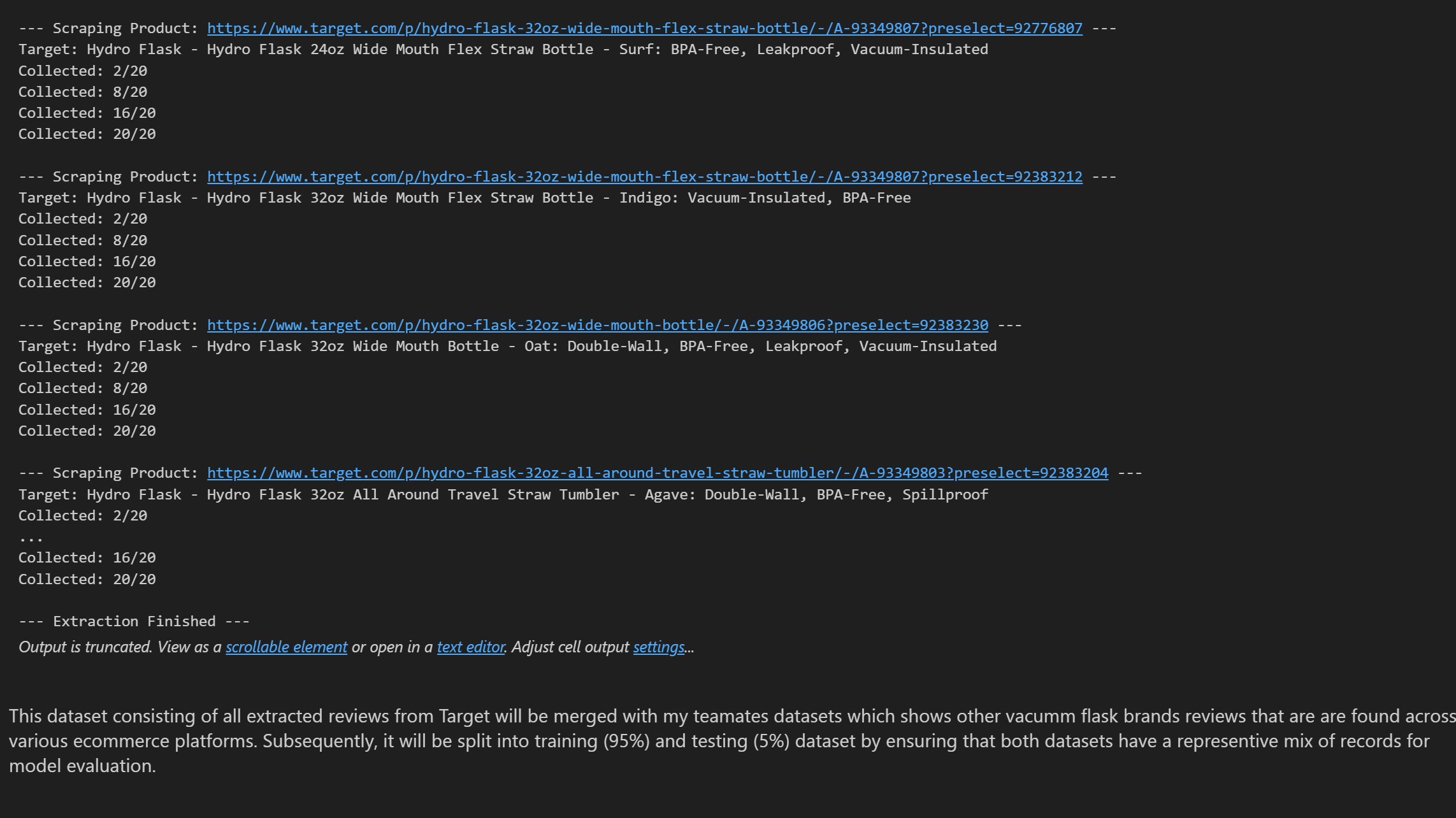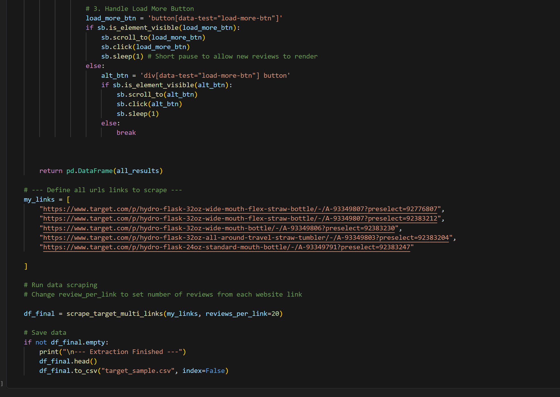 Extracting Hydro Flask reviews from dynamic Target.com e-commerce environments using Python web scraping.