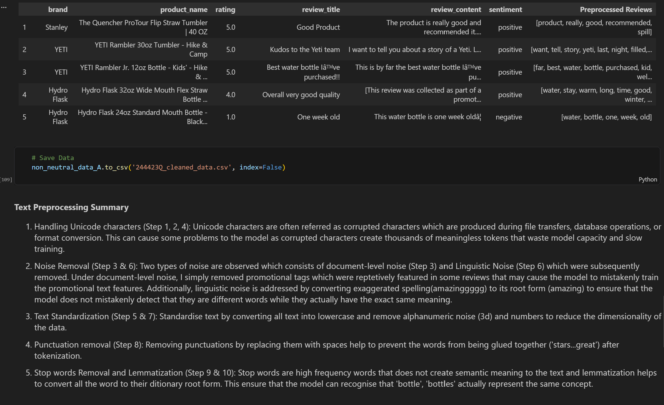 I engineered a resilient, automated system to extract high-quality review data from dynamic web environments. After orchestrating the integration of team-wide data, I developed a 10-step NLP preprocessing engine and a Bigram-based SVM model. While Bigrams increased complexity, the team ultimately prioritized a model that maximized Negative Recall, ensuring that the most critical "complaint" reviews were flagged automatically for business intervention.