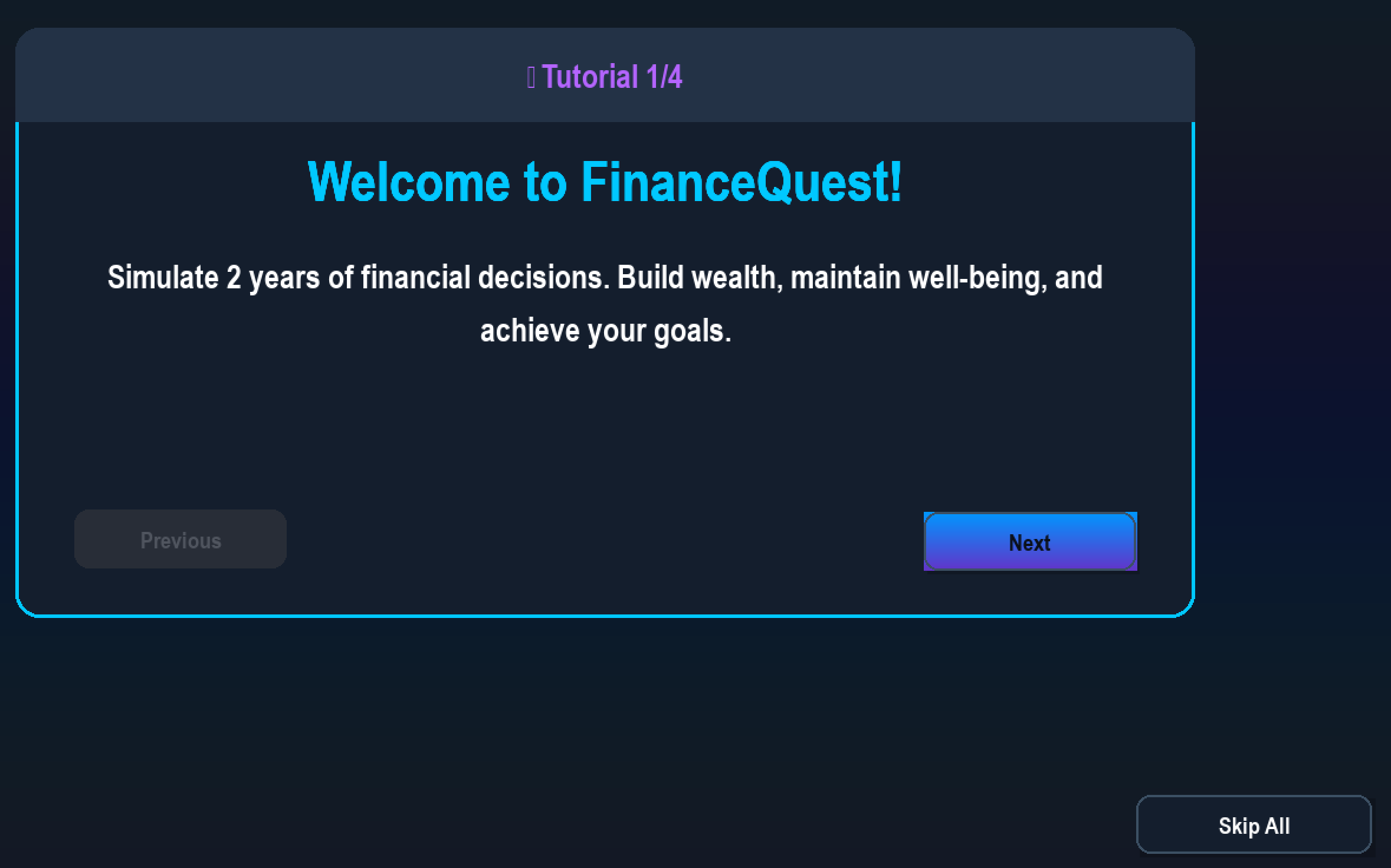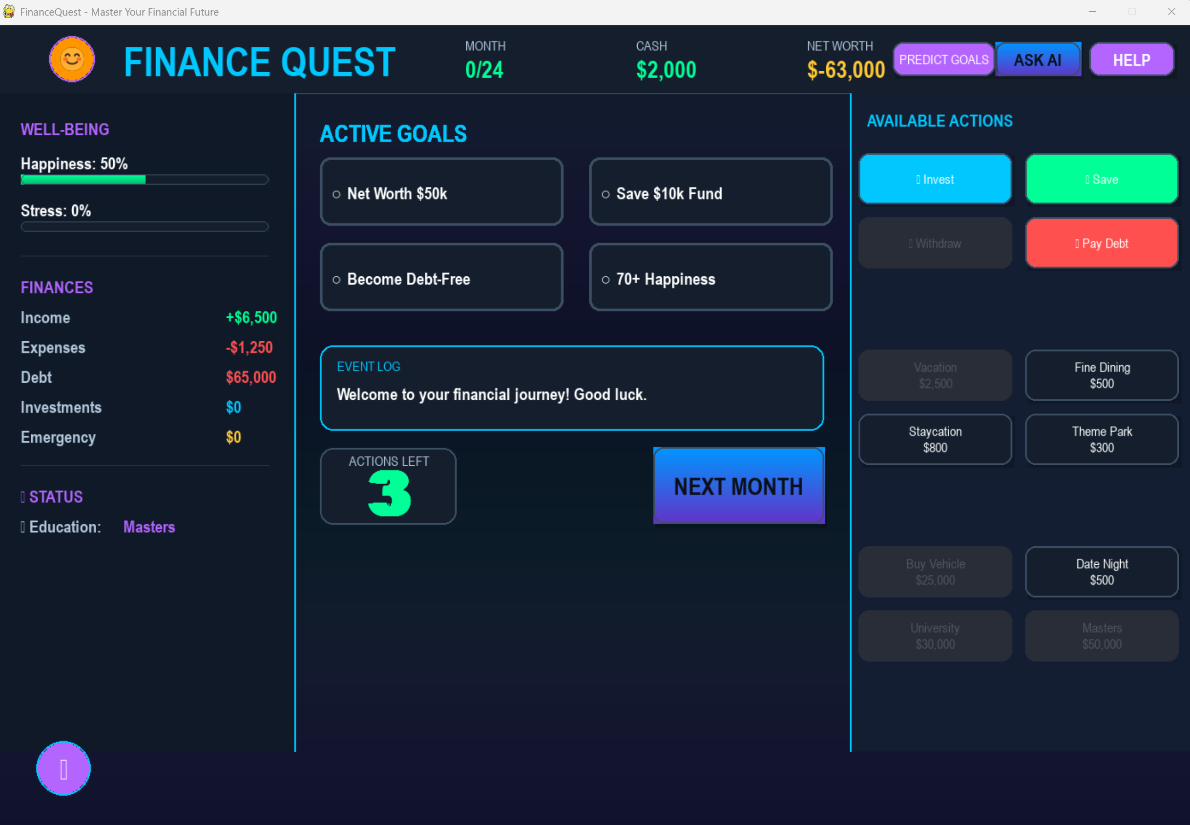 FinanceQuest is a financial simulation game developed during the NTU Tech For Good 2026 Hackathon. It combines interactive gameplay with machine learning to teach personal finance, helping players learn through realistic decision‑making within a structured 24‑month timeline.