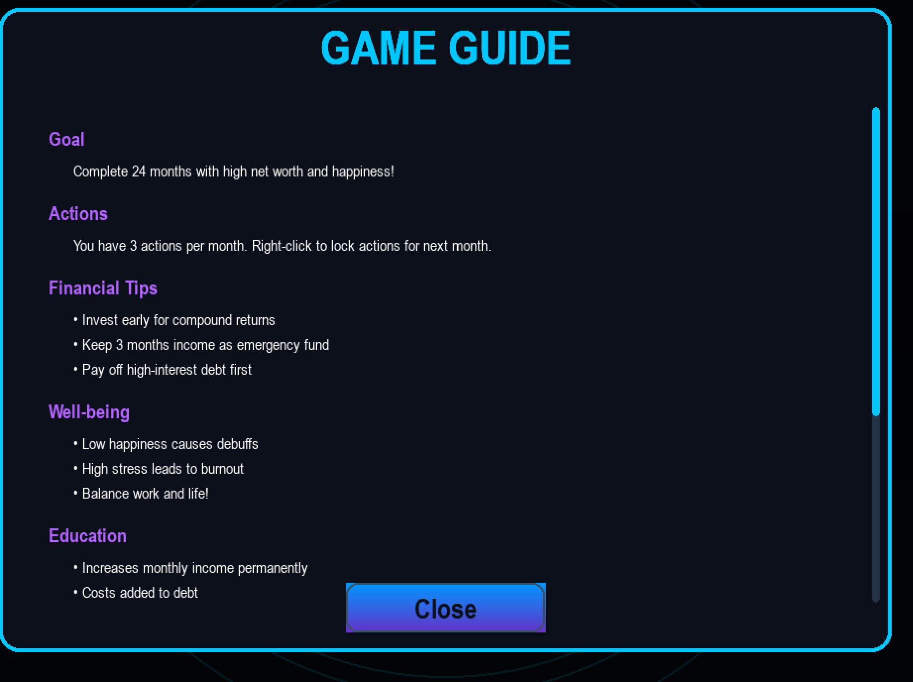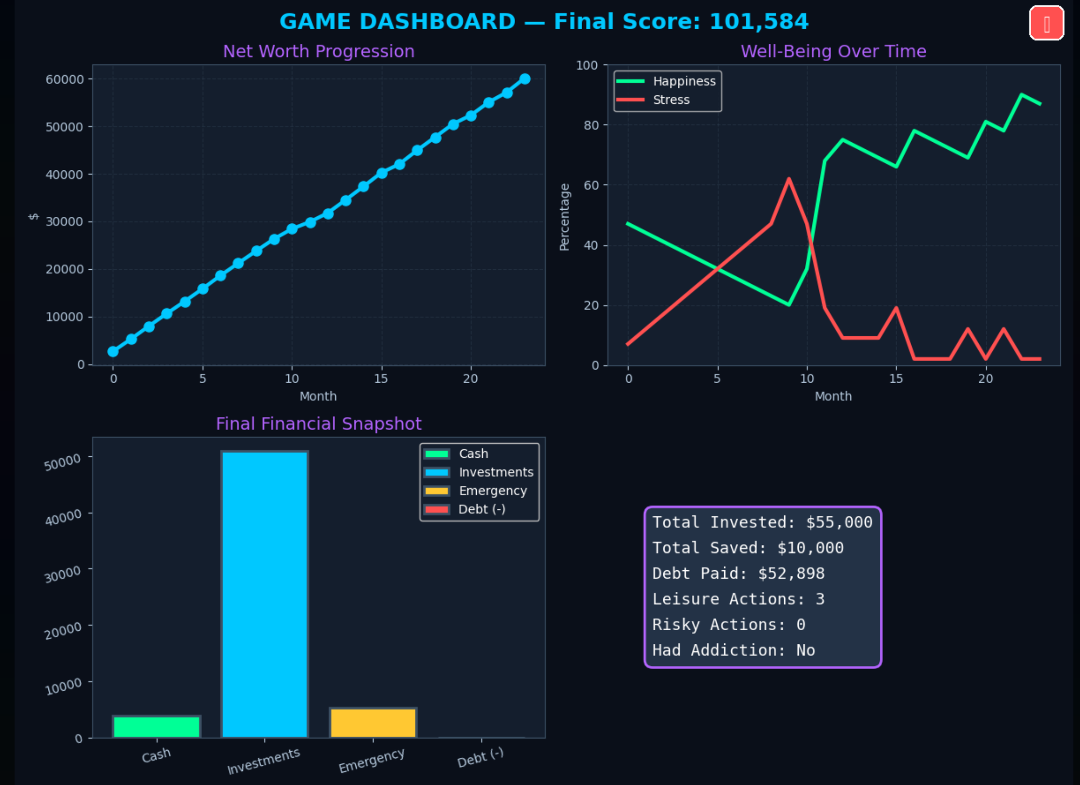 A Python‑based desktop game built with Pygame that simulates 24 months of financial decisions, with 3 actions per month. Key features:
